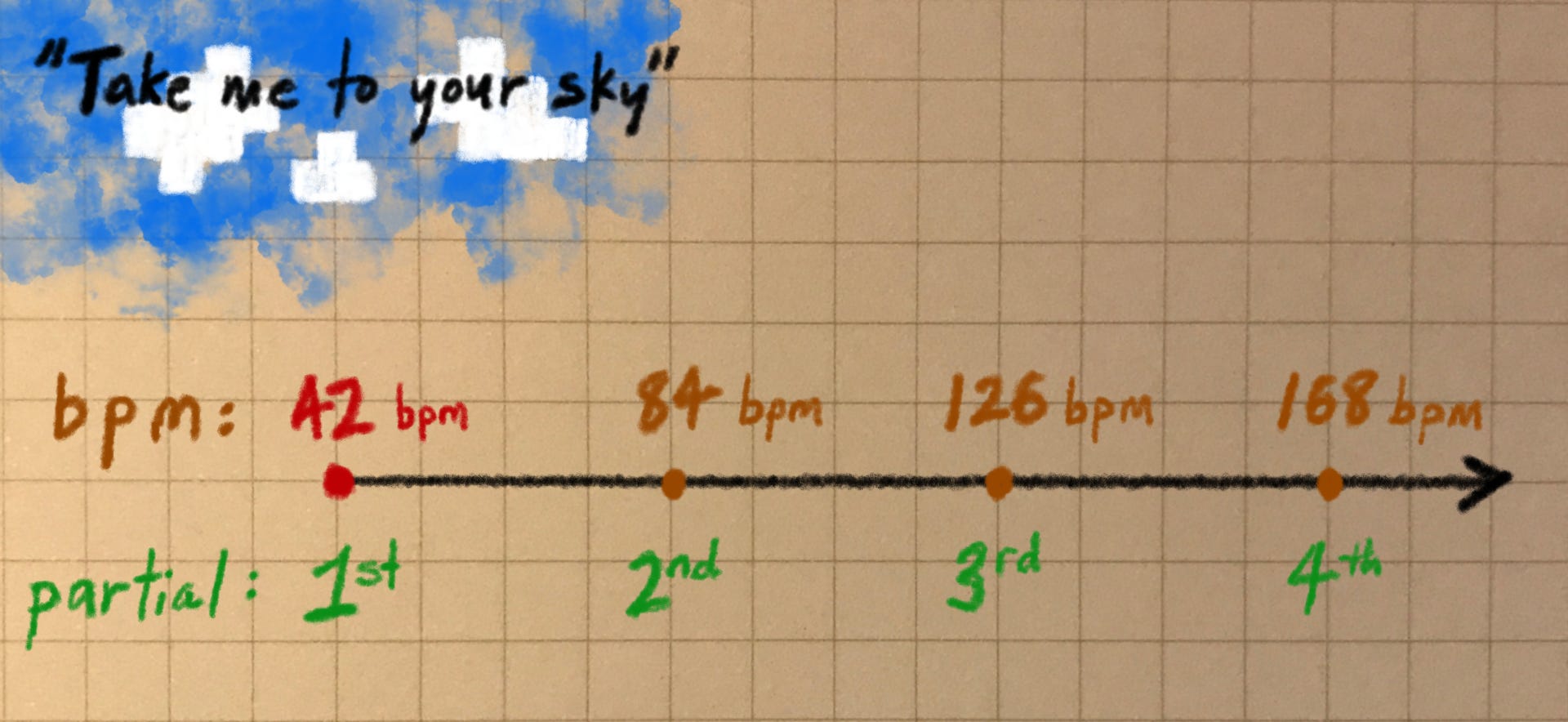 The tempo implications of Take Me To Your Sky can be mapped to a simple harmonic sequence with a fundamental (aka “1st partial”) tempo of 42 beats per minute.