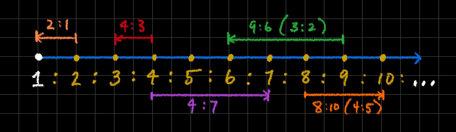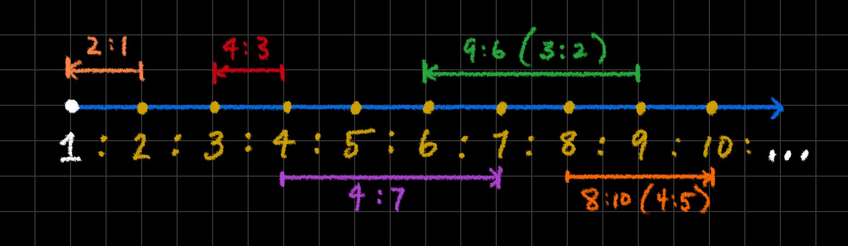 … because the harmonic series is a construction of every whole-number ratio, in order! It is a comprehensive encyclopedia of possibilities: pick any two partials… you have just named the ratio between them.